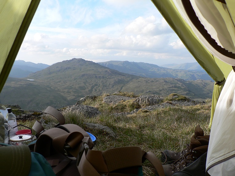 When I poked my head out of the tent, the landscape was transformed, veils of cloud hung low in the valleys and between the summits, swirling and changing as the weather came in from the west. It was still early, so I sat outside the tent, wrapped in my sleeping bag and watched the panorama.