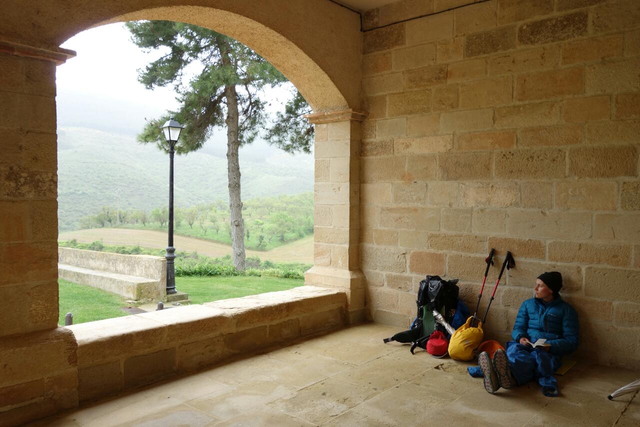 Contemplating the rain and hoping Barry will make the tea!- A welcome rest under the porch of a monastery in the Sierra de Codes.